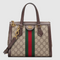 - The world of Ophidia evolves with the introduction of a small top handle tote with a detachable shoulder strap. Crafted in Brand Supreme canvas with inlaid green and red Web stripe. the accessory is enhanced by a petite play on the Double G. an archival Gucci code from the '70s that appears atop a leather tab detail and on the zipper pull.